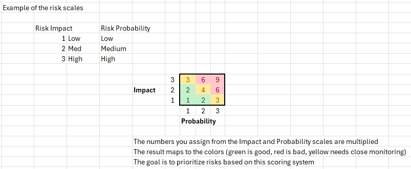 You can use a simple scale for both factors, such as 1 (low) to 5 (high). Multiply the likelihood and impact scores together to get a risk score. For example, a risk with a likelihood of 4 and an impact of 3 would have a risk score of 12.