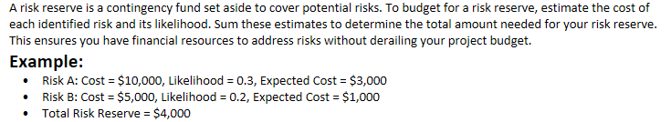 A risk reserve is like an emergency fund; a contingency fund set aside to cover potential risks if they occur. To budget for a risk reserve: